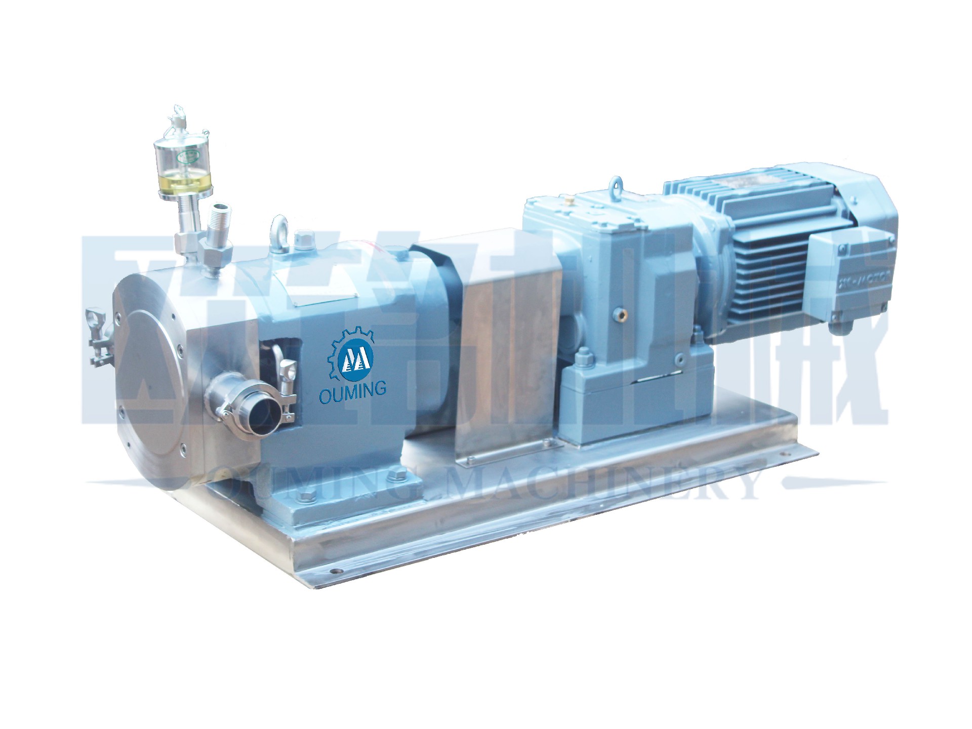 該產品借助于工作腔里的多個固定容積輸送單位的周期性轉化來達到輸送流體的目的。原動機的機械能通過泵直接轉化為輸送流體的壓力能,泵的流量只取決于工作腔容積變化值以及其在單位時間內的變化頻率,而(理論上)與排出壓力無關;轉子泵依靠兩個同步反向轉動的轉子(轉子葉數為2-8)在旋轉過程中于進料口處產生吸力(真空度),兩轉子將轉子室分隔成幾個小空間,在傳動軸的帶動下進行反方向旋轉,介質即被輸送至出料口,從而產生了較高的排放壓力,如此往復循環,特別適合中高粘度介質的輸送。