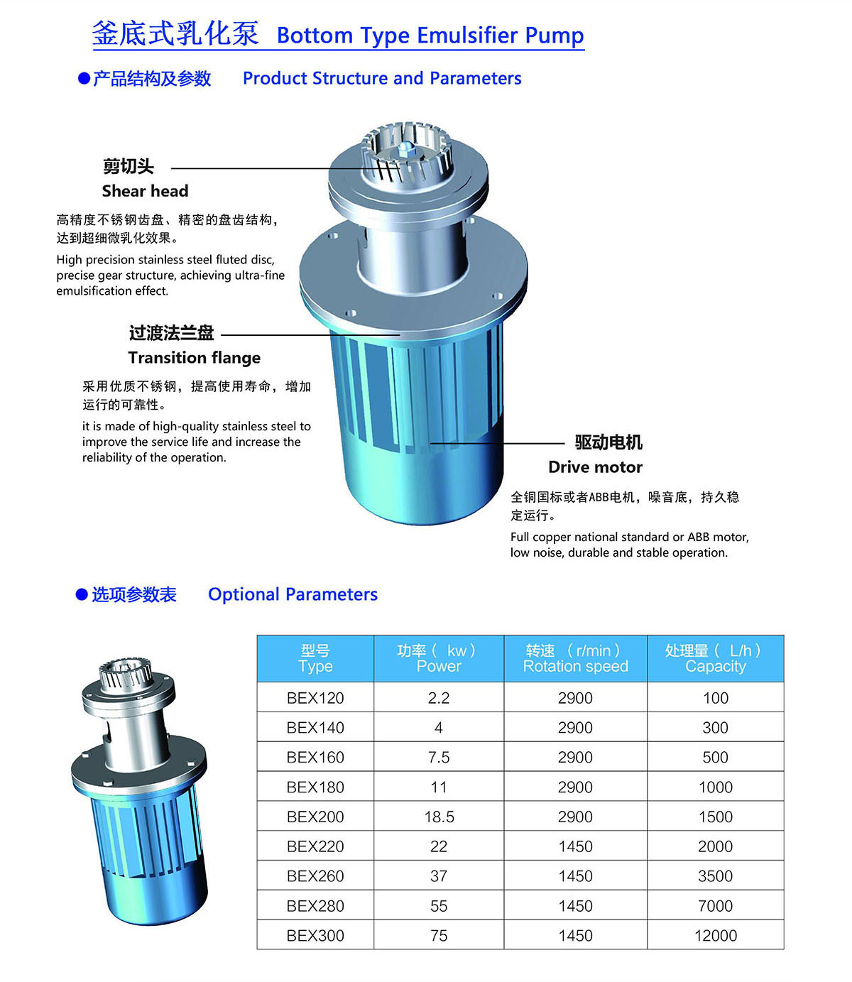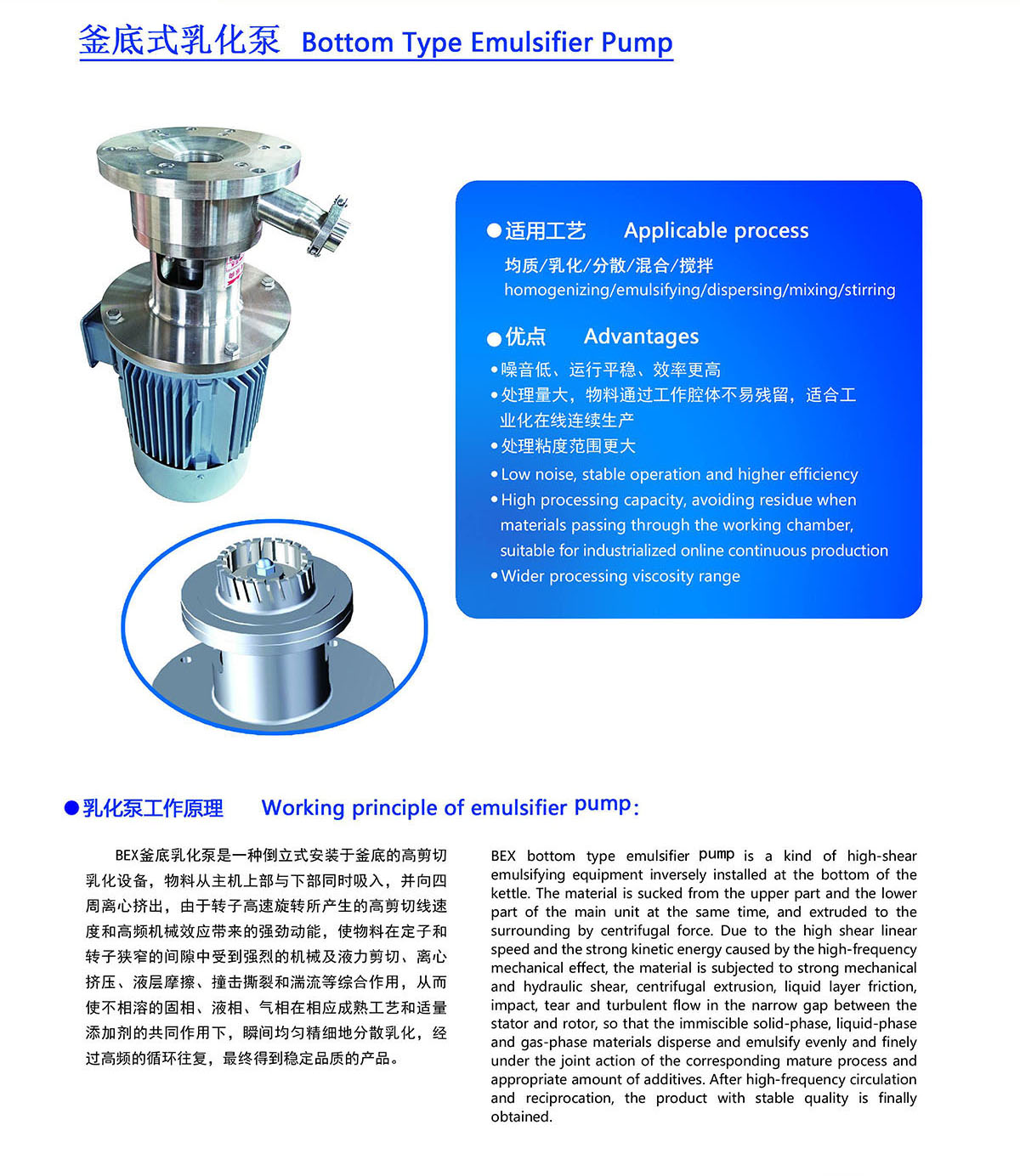 BEX釜底乳化泵是一種倒立式安裝于釜底的高剪切乳化設備,物料從主機上部與下部同時吸入,并向四周離心擠出,由于轉子高速旋轉所產生的高剪切線速度和高頻機械效應帶來的強勁動能,使物料在定子和轉子狹窄的間隙中受到強烈的機械及液力剪切、離心擠壓、液層摩擦、撞擊撕裂和湍流等綜合作用,從而使不相溶的固相、液相、氣相在相應成熟工藝和適量添加劑的共同作用下,瞬間均勻精細地分散乳化,經過高頻的循環往復,最終得到穩定品質的產品。